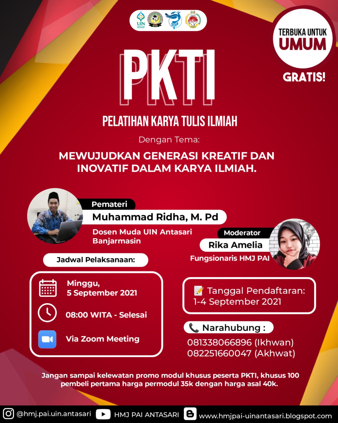 Himpunan Mahasiswa Jurusan Pendidikan Agama Islam (HMJ PAI) Fakultas Tarbiyah dan Keguruan UIN Antasari Banjarmasin mengadakan kegiatan Pelatihan Karya Tulis Ilmiah Online (PKTI Online) dengan tema : “ Mewujudkan Generasi Kreatif dan Inovatif dalam Karya Ilmiah “ bersama pemateri bapak Muhammad Ridha, M. Pd Dosen Muda UIN Antasari Banjarmasin yang di bimbing oleh Rika Amelia selaku moderator. Acara dibuka dengan pembacaan kalam Ilahi oleh saudara Shifa Hayati Mahasiswa Program Studi Pendidikan Agama Islam.