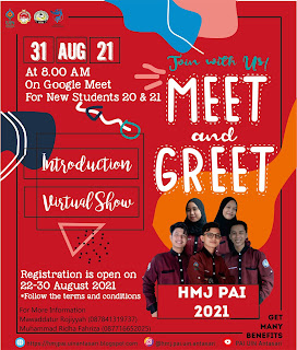Acara ini dimulai dengan pembukaan, dilanjutkan sambutan dari Ketua Umum HMJ PAI 2021 Ahmad Ridani. Kemudian dilanjut dengan ramah tamah HMJ PAI bersama mahasiswa/i baru 2021 dan terakhir dilanjutkan dengan Penampilan Seni Virtual melalui youtube sekaligus menjadi penutup pada acara Meet and Greet x Penampilan Seni Virtual HMJ PAI 2021.