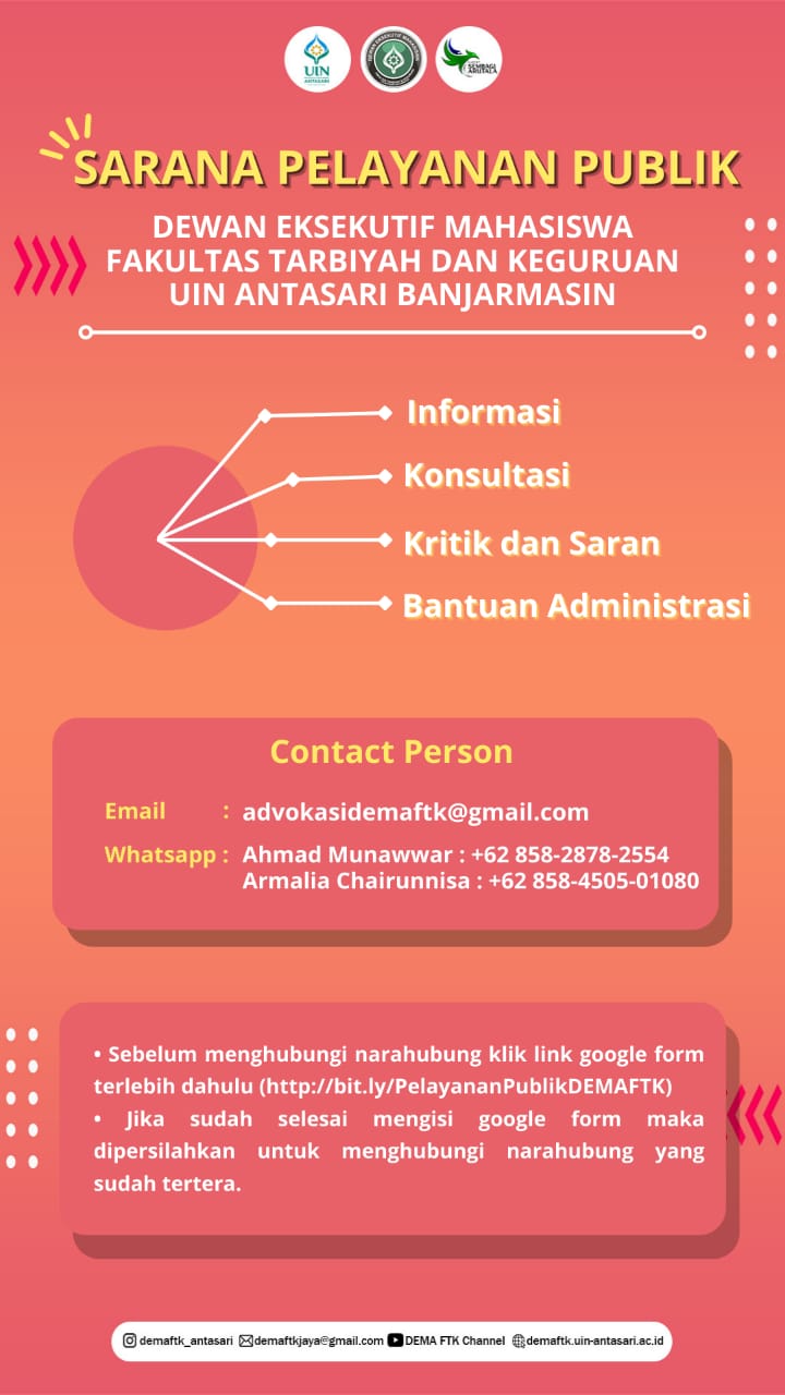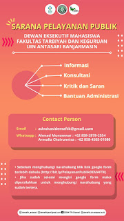 Kami Dari Dewan Eksekutif Mahasiswa Fakultas Tarbiyah dan Keguruan UIN Antasari Banjarmasin menyediakan SARANA PELAYANAN PUBLIK untuk seluruh Mahasiswa FTK UIN Antasari Banjarmasin.